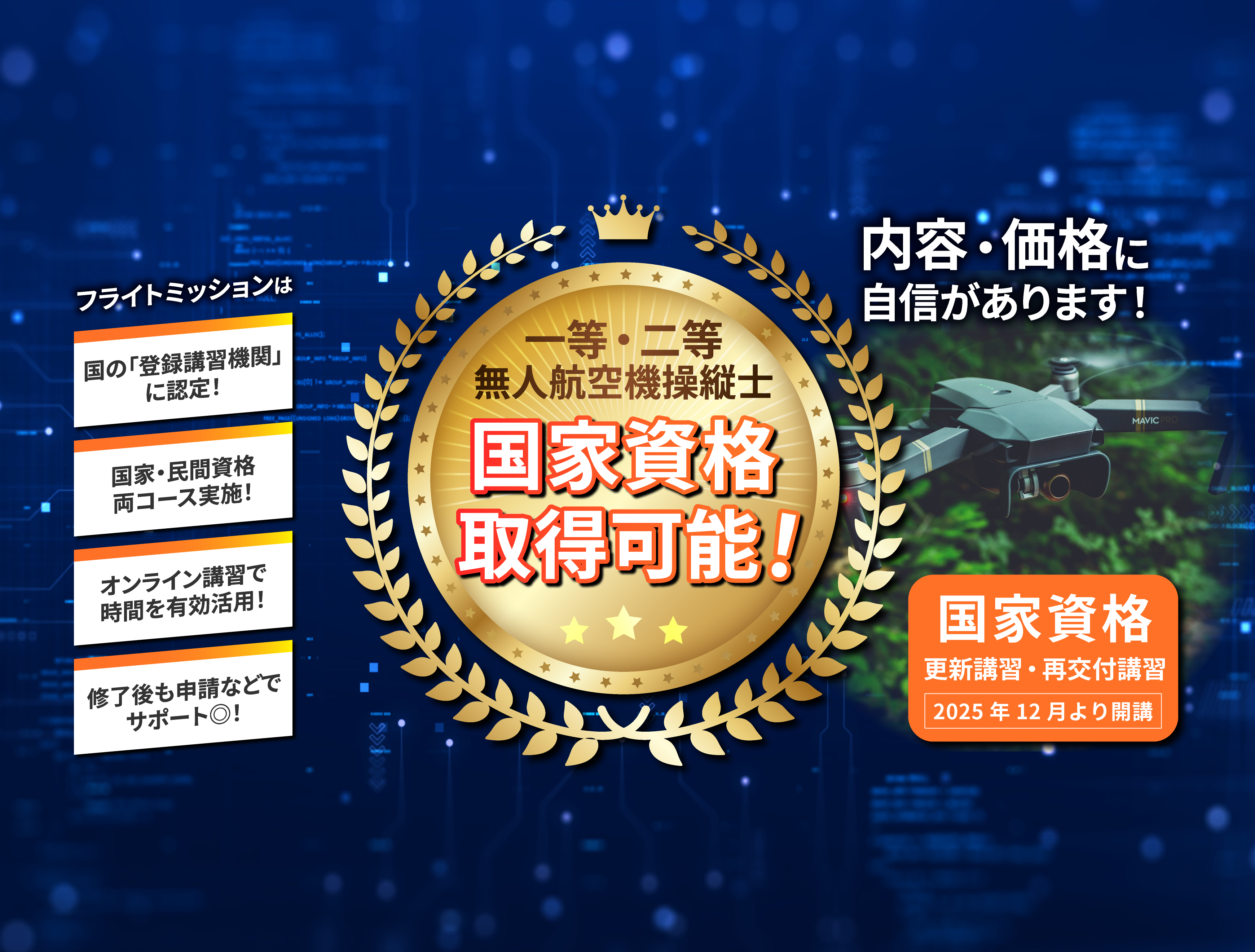 ドローンスクールFight Mission海浜幕張では、国土交通省認定の「無人航空機操縦士」の取得をサポートしています。