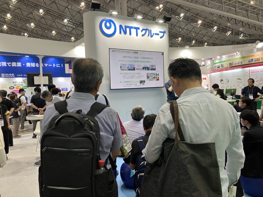 (NTTグループが展示していたスライド。農業の最前線を学ぶため多くの人が周りに集まっていた)
