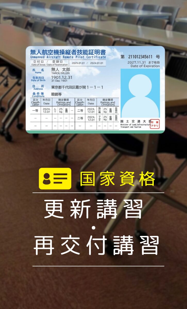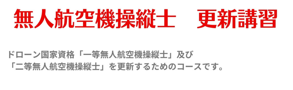 ドローン国家資格「一等無人航空機操縦士」及び「二等無人航空機操縦士」を更新するためのコースです。