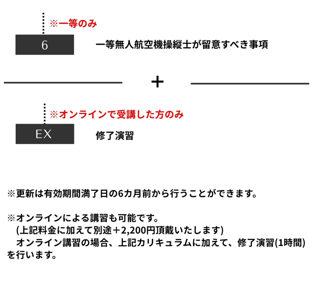 ※更新は有効期間満了日の6カ月前から行うことができます。 ※オンラインによる講習も可能です。(上記料金に加えて別途+2,200円頂戴いたします) オンライン講習の場合、上記カリキュラムに加えて、修了演習(1時間)を行います。