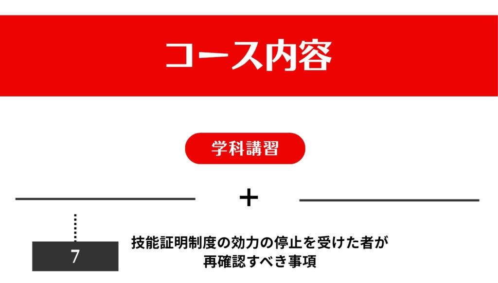 技能証明の効力停止処分を受けた方については、上記更新講習に加えて下記講習を受ける必要があります。